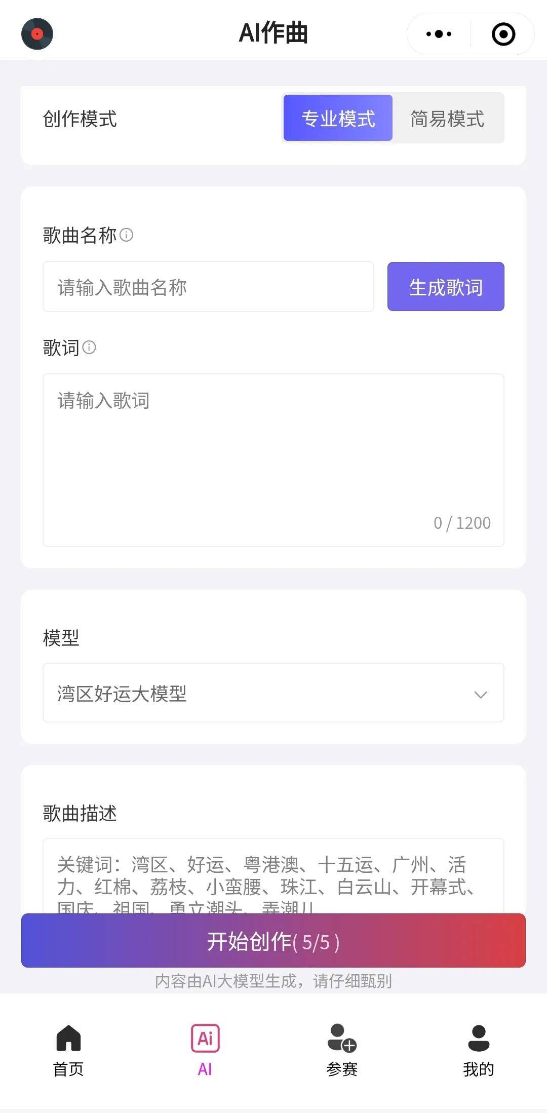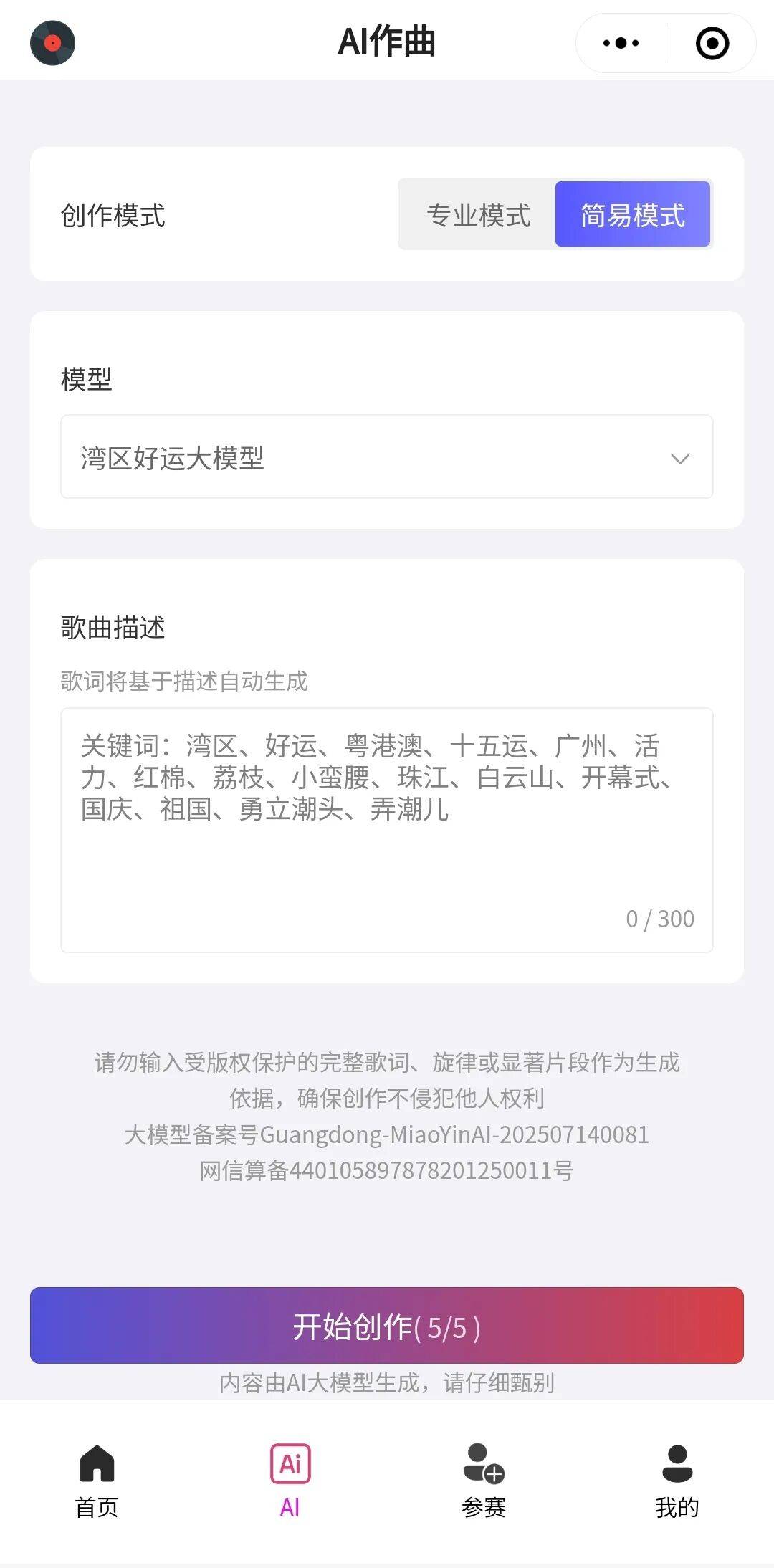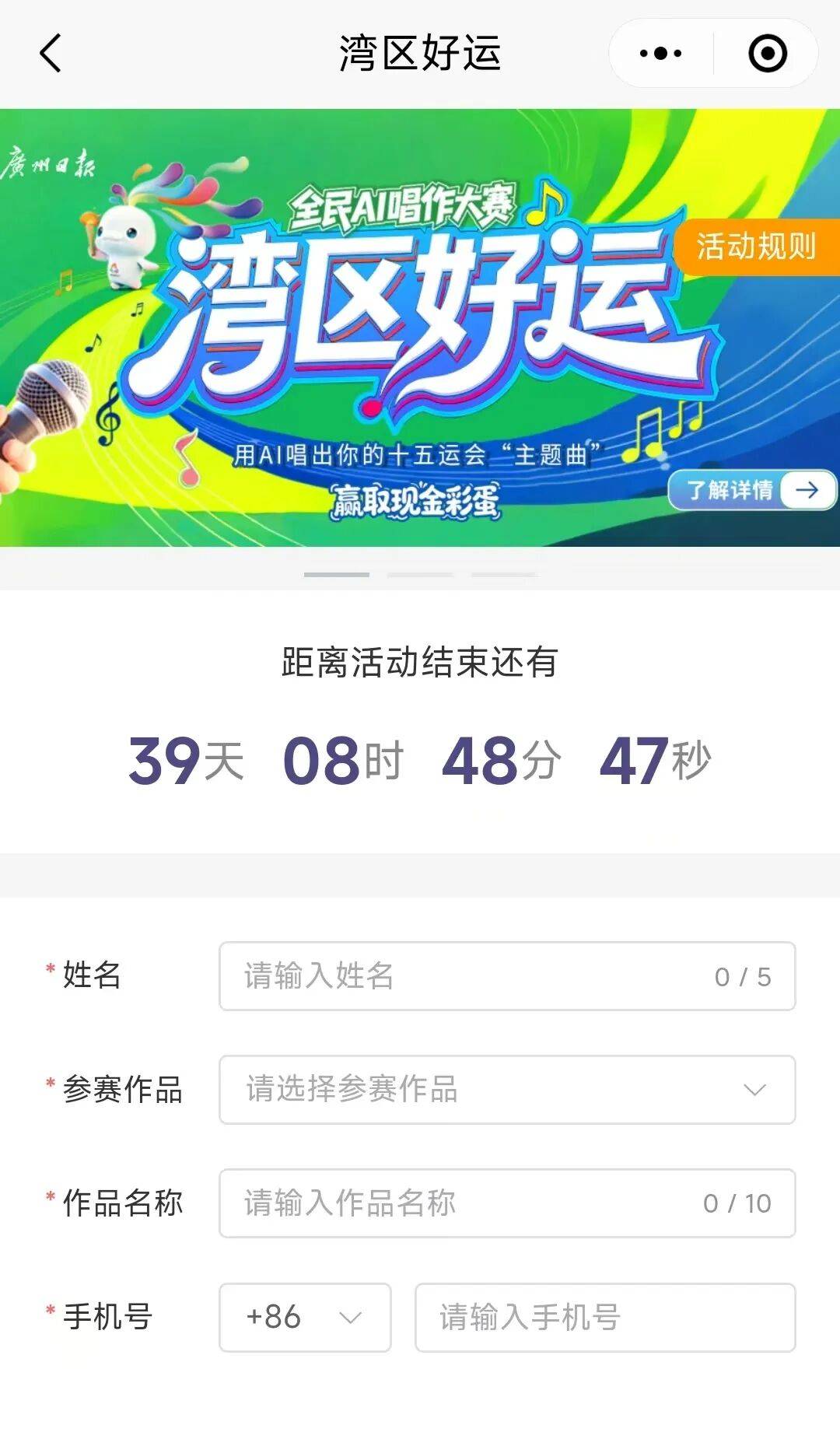 可输入你对十五运嘉会和夸姣大湾区的歌曲描述,可选择对劲的做品参取音乐评选。